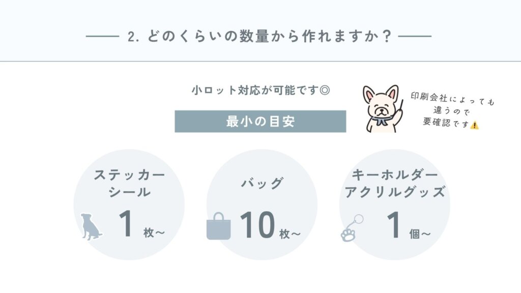 A. ペットリエでは、小ロットから対応できるアイテムを中心にご提案しています^^