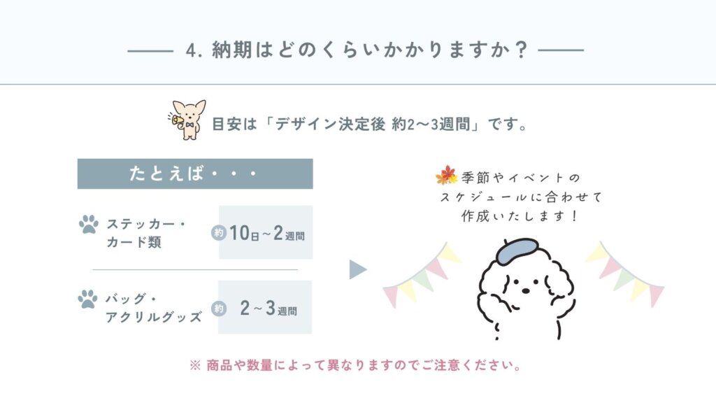 A. 商品や数量によって異なりますが、目安は「デザイン決定後 約2〜3週間」です。