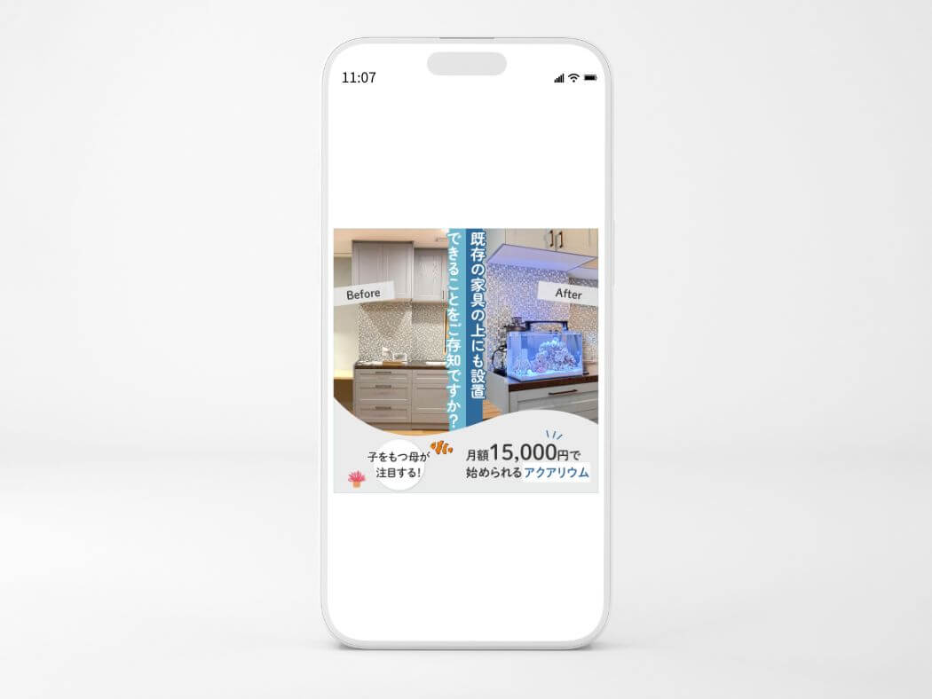 一般のご家庭に水槽設置するイメージが湧くように、かつターゲット層に当たる主婦層へアピールできるよう柔らかい印象になるようイメージしています。