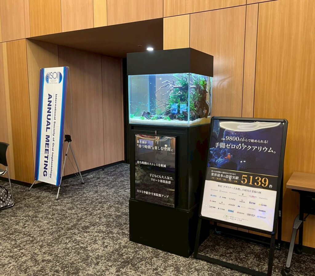 深いブルーを基調にアクアリウムの世界観を表現し、上品で信頼感のあるトーンにし、中央には「手間ゼロのアクアリウム」というキャッチを大きく配置し、導入のしやすさを訴求しました。