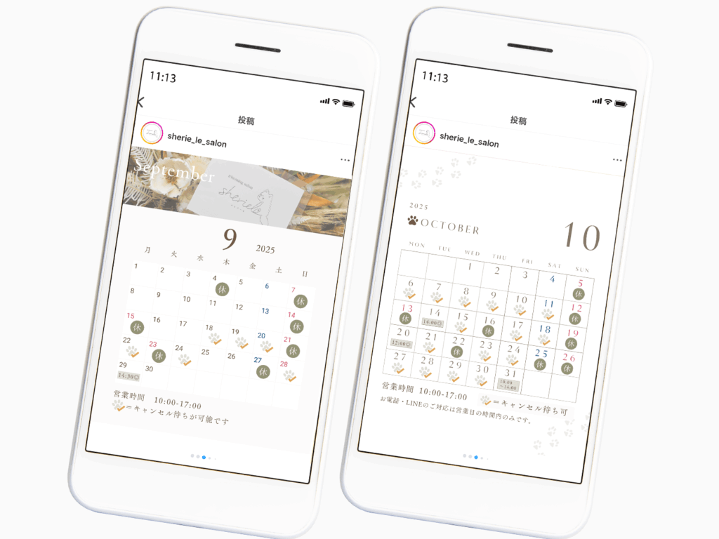 カレンダーは、空きとキャンセル待ちがわかるようにし、上部にはシェリール様の素敵なお写真をいれられるようにしました。デザインは2種類あり、交互に使用予定です。