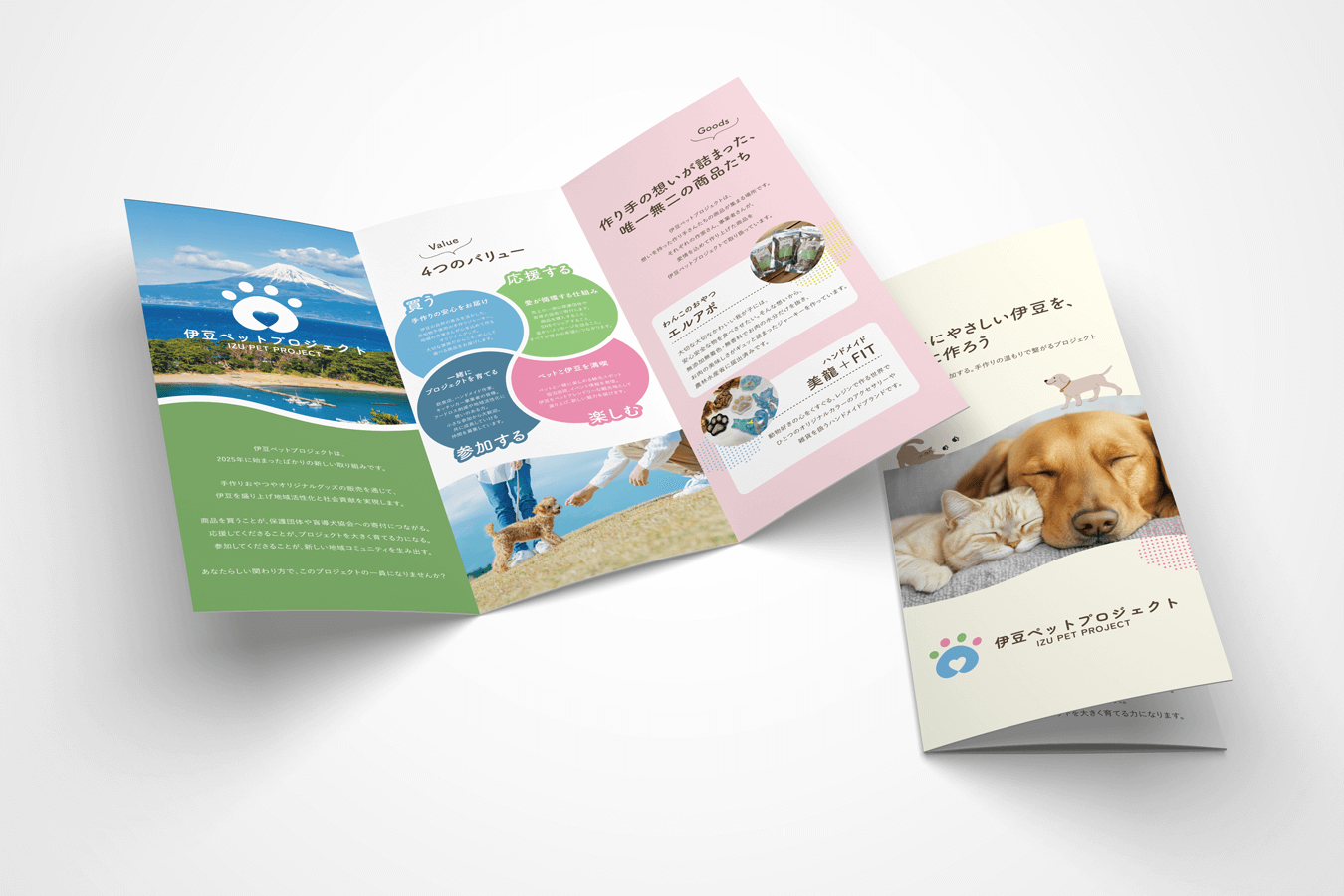 伊豆ペットプロジェクト様の三つ折りパンフレットを作成させていただきました。
